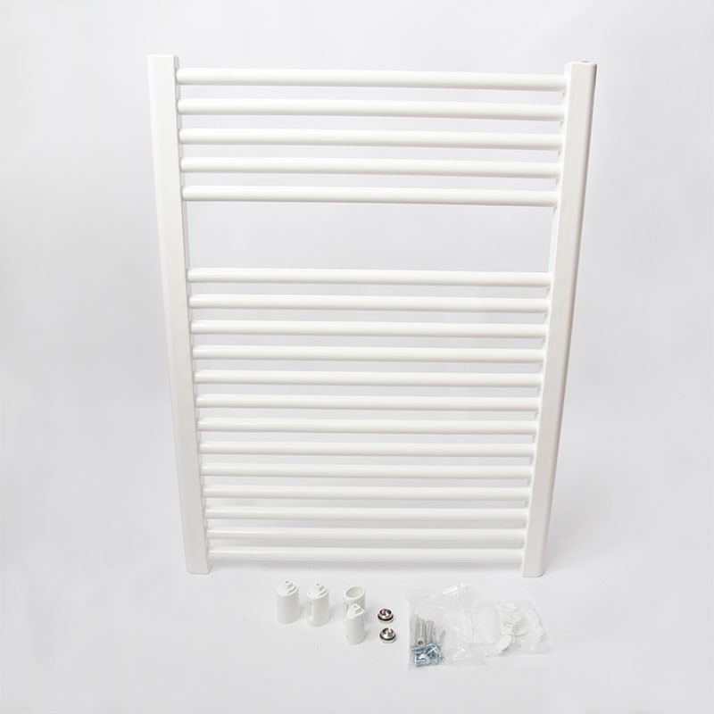 Toalleros fabricados formando dos colectores rectangulares verticales de acero de 40 x 30 x 1,5 mm y la superficie radiante con tubos de acero horizontales de ø 25 x 1,5 mm que unen los dos colectores.
